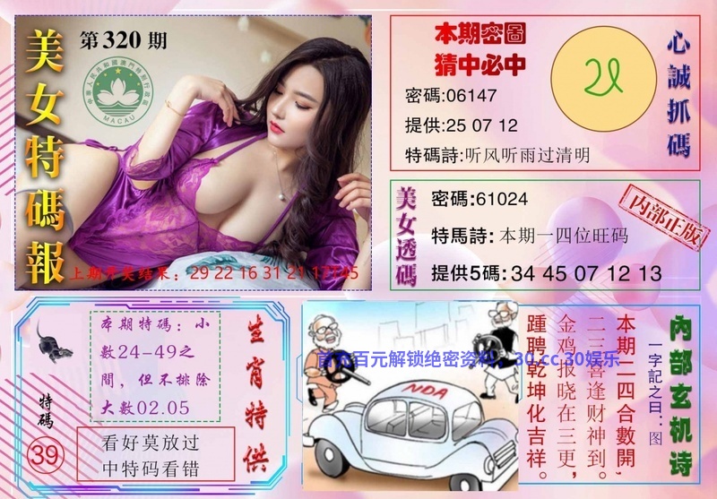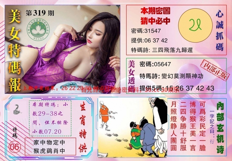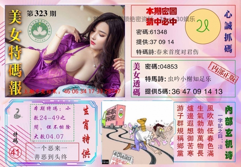 | 324期:闲情暗语:【更新】《發00》 解释:更新中 综合特肖:更新中 |